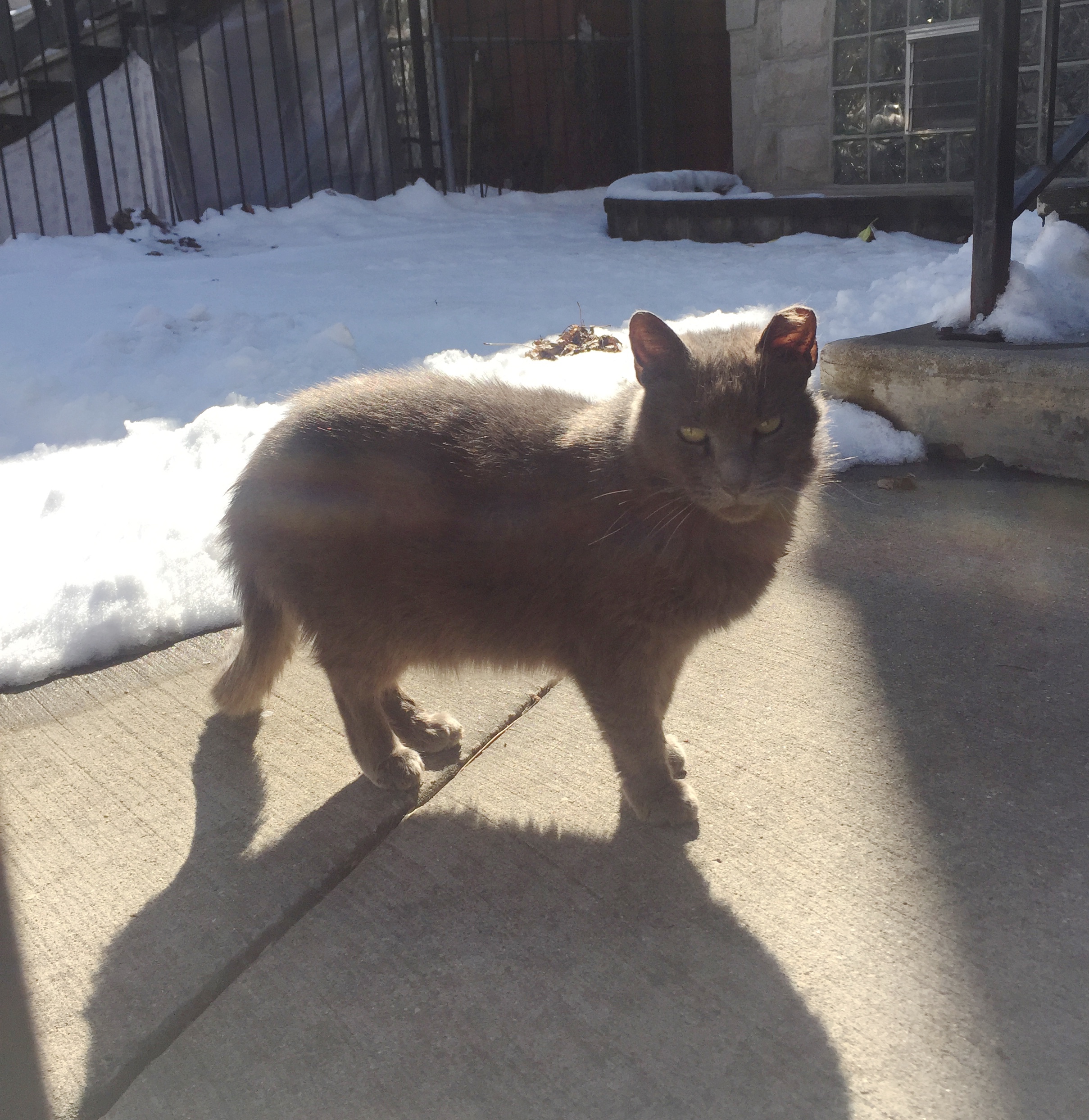 OK, I’ll go on to Wolfie’s story, it just had me thinking, as it tied into so much of what happened these past few years with me and other people wanting me to help them with their animals. Wolfie showed up in one of Jennie’s colonies last spring. Jennie currently cares for 26-28 TNR’d cats outside in West Humboldt Park. Another 60-80+ cats from her area were moved into adoption, sanctuary or other locations since 2011 with the help of a no-kill shelter and their volunteers. I first met her then when I helped trap a few times in her area as a volunteer. She currently also has 10 rescued cats, one bird, one turtle and a dog in her home. She is overwhelmed, physically and financially unable to fully vet and feed all of the outdoor cats all of the time. With your help and donations this year, I’ve been delivering cat food to her, and I’ve vetted three of her colony cats so far: Mooksie, Gorgeous George, and Wolfie.