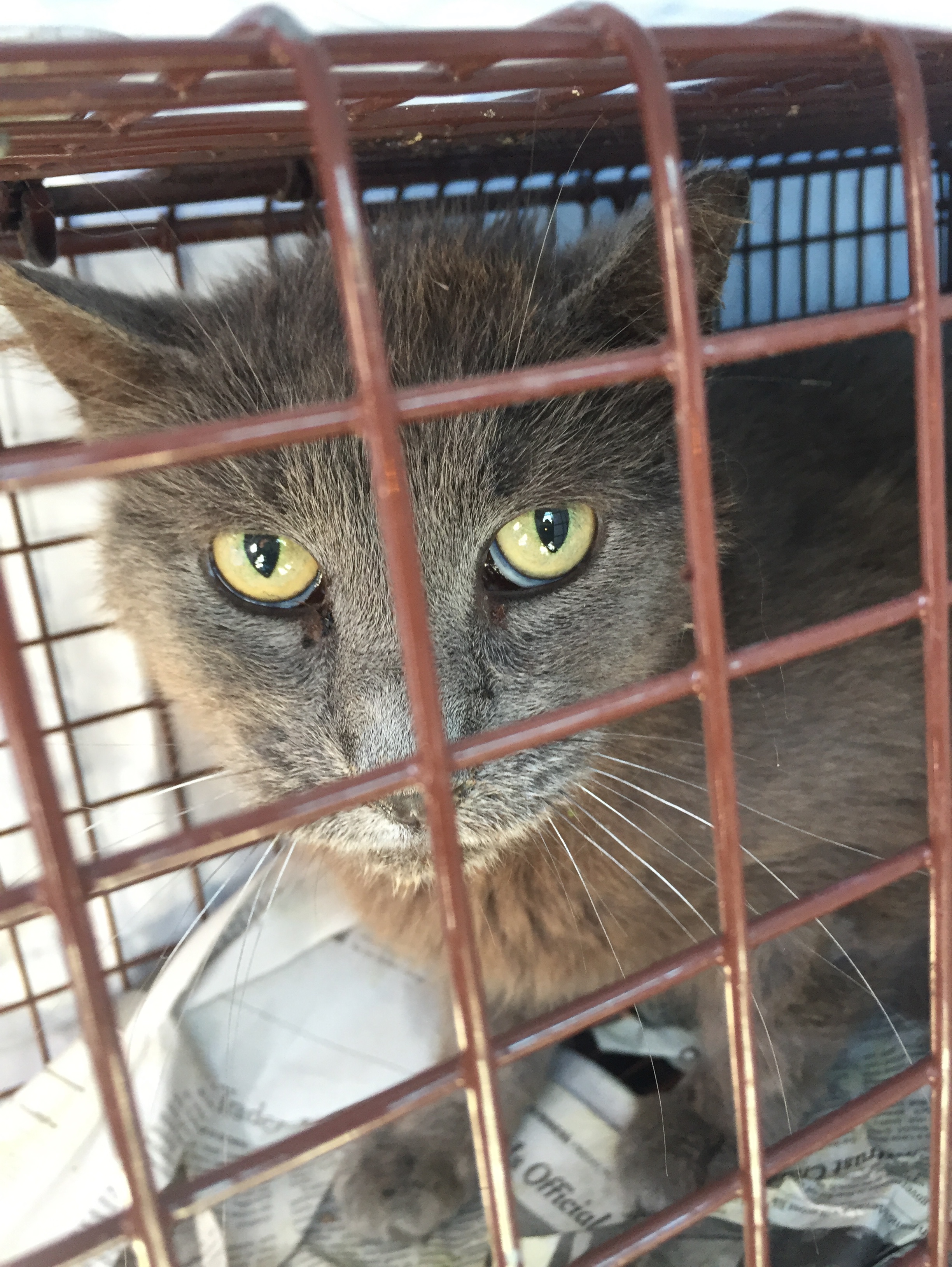 After awhile, Jennie saw that Wolfie would show up at one of her feeding stations covered in diarrhea. By this time it was summer, June, and I agreed to take him to my vet. Since he was able to be handled, she put him into a carrier instead of a trap. That day I was also taking two other cats for vetting from two other colonies. Normally I treat all cats from outside initially as ferals, no matter their temperament, but he was so sweet and friendly in the carrier. He reached for me, meowed, and clearly wanted attention.