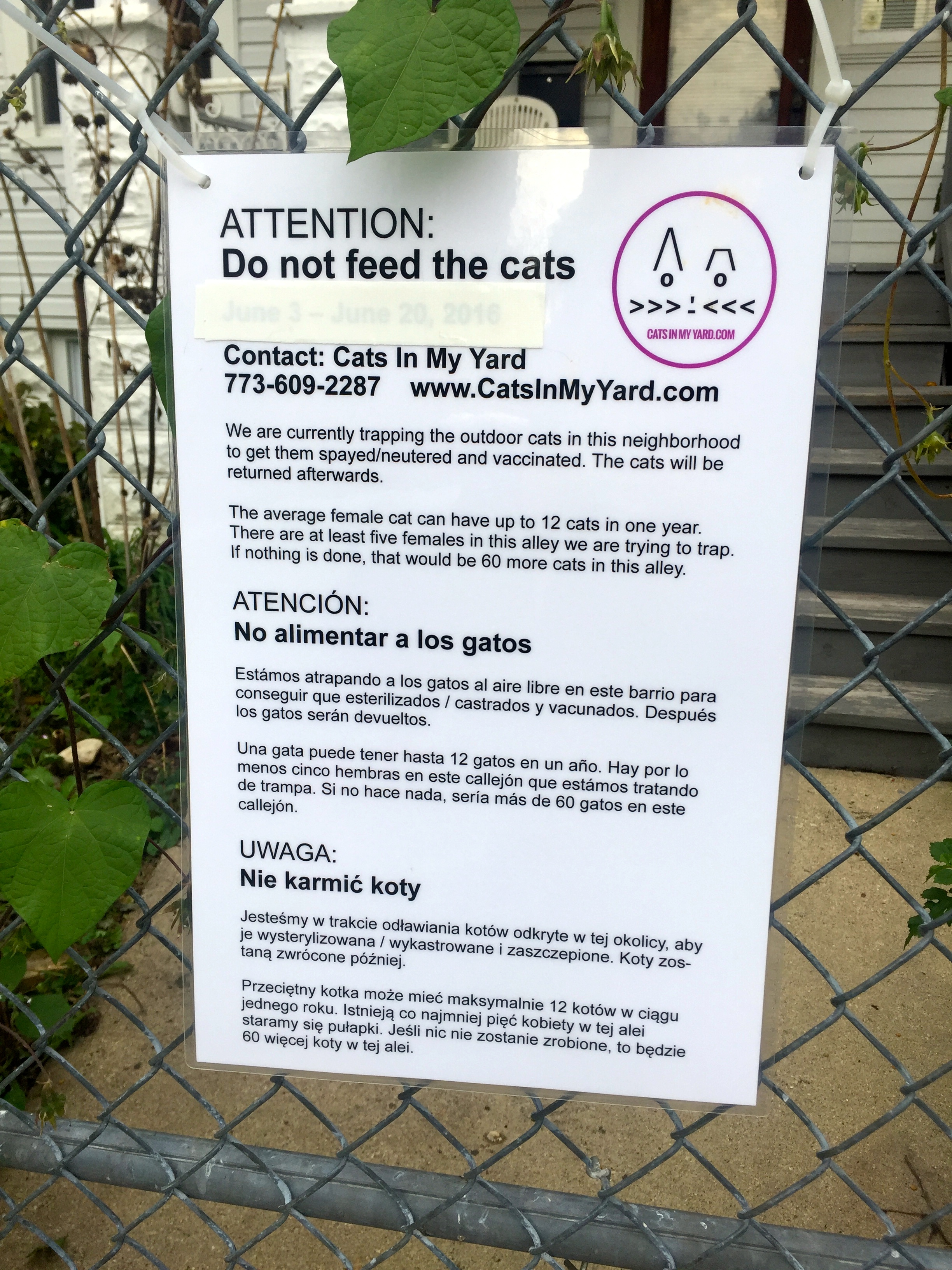 We set up a Cats In My Yard sign on Melanie’s front gate to explain to everyone what we were doing. It’s translated in Spanish and Polish. We saw A LOT of people stopping to read the sign. Everyone was into it and gave us the thumbs up after reading it, or asked us more questions. It’s a great way to spread awareness of your TNR project in the neighborhood.