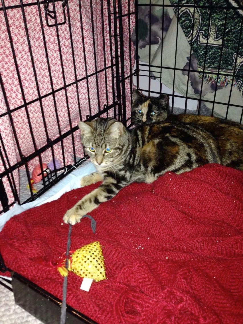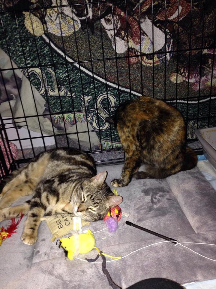 Considering at this point they came from outdoor drain pipes, to the clinic, to Joann’s basement, to vet appointments, and then now to Robin’s house, all within long car rides in traps and carriers, Pinky and The Brain were doing remarkably well. They were first crated together in Robin’s foster room, where they slowly learned to play.