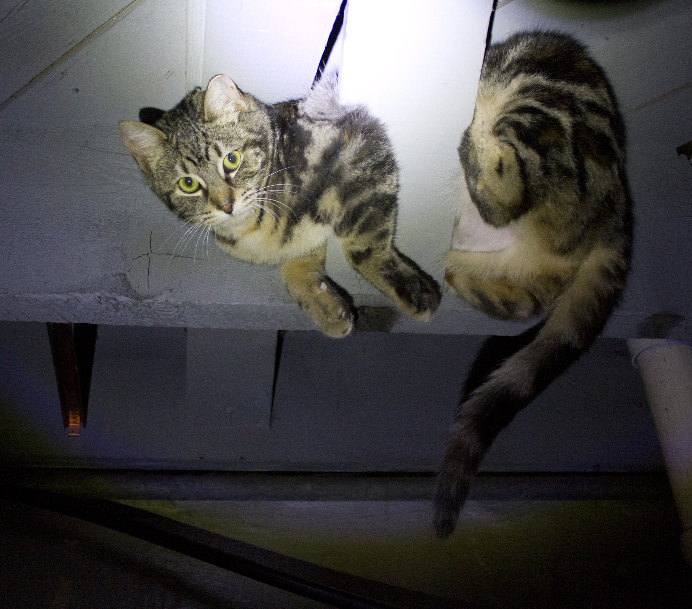 They were shy, but still did well around her. They purred and wanted to be pet. Problems only came about when Joann would try to get them into pet carriers for transport and vetting. At one point, The Brain got out and went straight for the rafters in her basement.